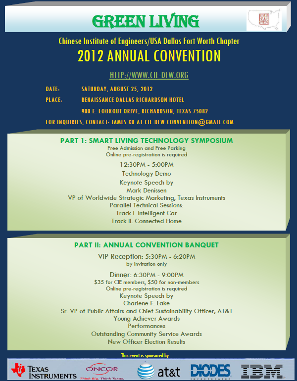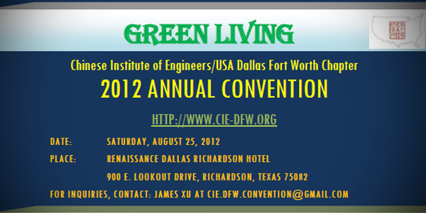 Chinese Institute of Engineers/USA – DFW Chapter invites you to join the CIE Annual Convention Dinner Banquet. The theme of the convention is Green and Smart Technology for the New Decade. Following the Technology Symposium in the afternoon (register separately), the convention banquet will be held from 5:30 PM to 9:00 PM.