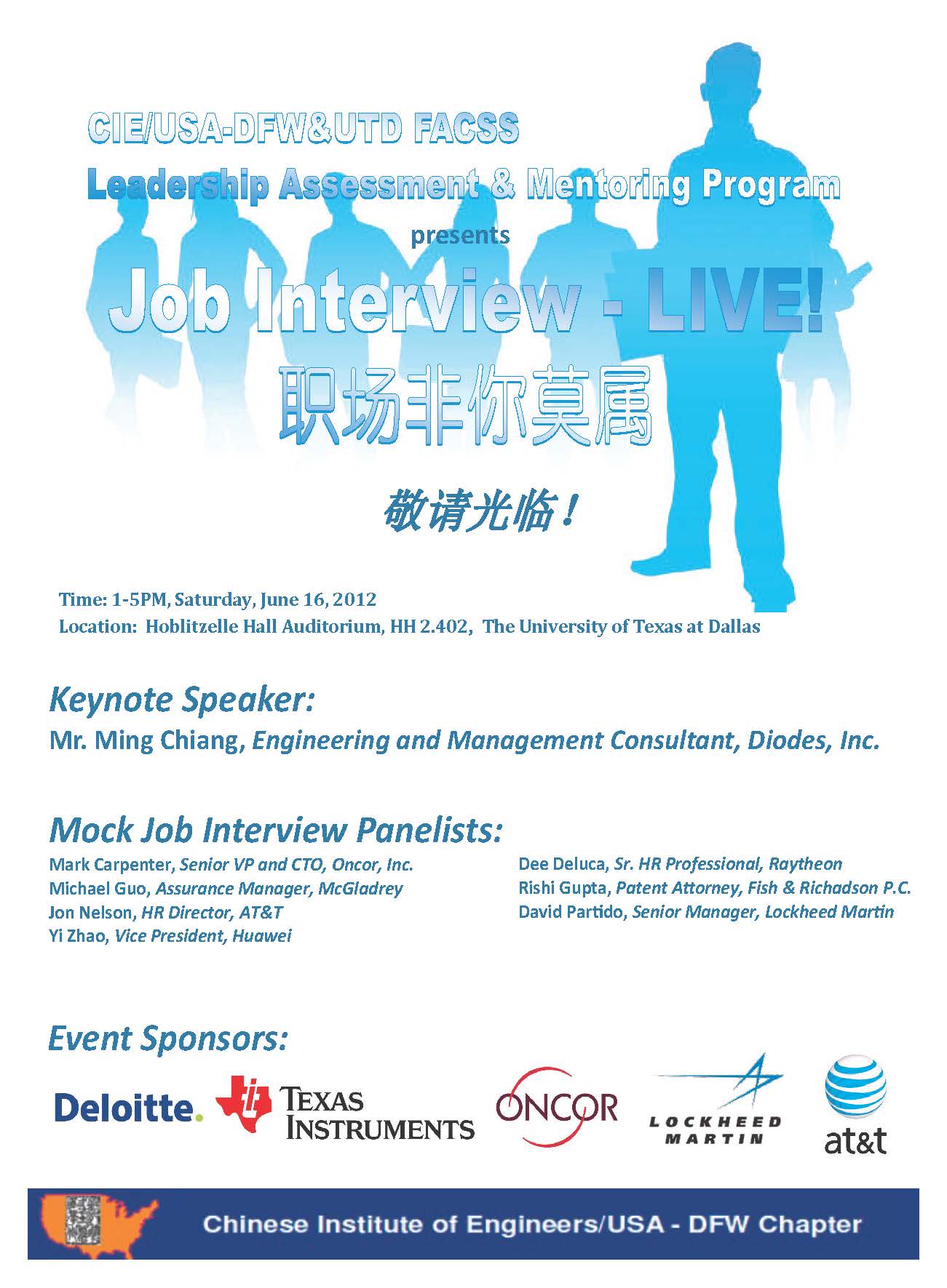 The CIE-LAMP, or 2012 CIE-FACSS Leadership Assessment and Mentoring Program Symposium, is co-hosted by Chinese Institute of Engineers/USA DFW Chapter (CIE) and Friendship Association of Chinese Students and Scholars (FACSS) at University of Texas at Dallas.