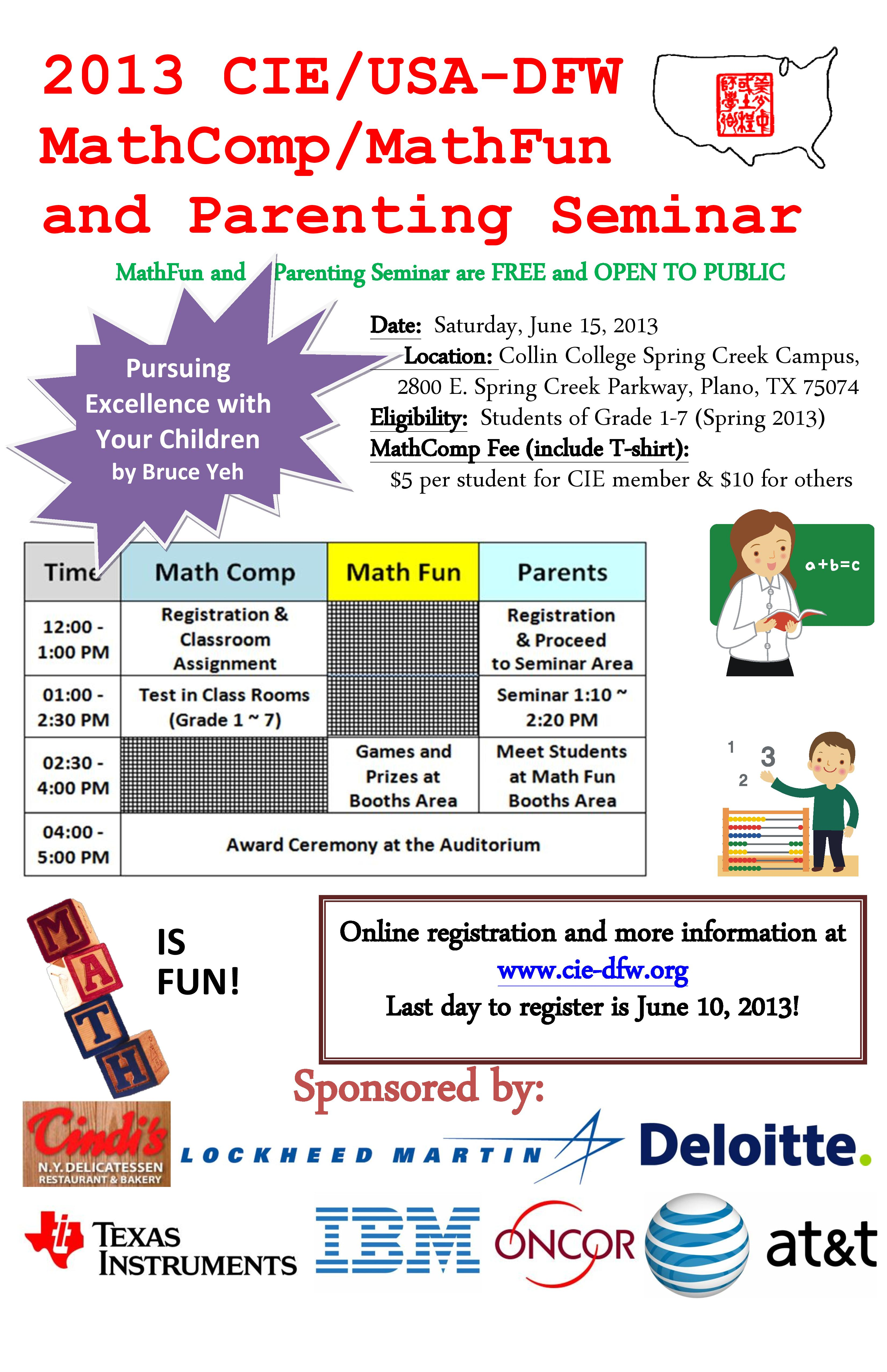 This grand math fair is composed of a math competition, a math fun fair and a parenting seminar. It will be held on June 15, 2013 (Saturday) 12:00pm – 5:00 pm at the Collin College, Spring Creek Campus at the Conference Center.