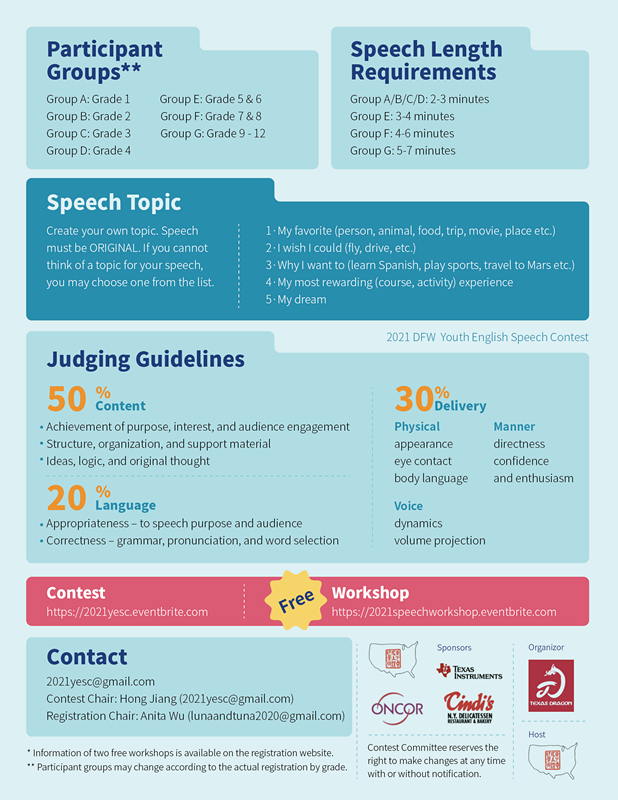 The goal of the contest is to stimulate young students’ interests and boost their confidence and competence in public speaking by providing an opportunity for them to enhance their speaking skills. This event has served the DFW community for over 10 years, and each year it attracts over 100 students from 1st to 12th grades for the contest and hundreds of participants including parents, educators, and volunteers involving this event.
