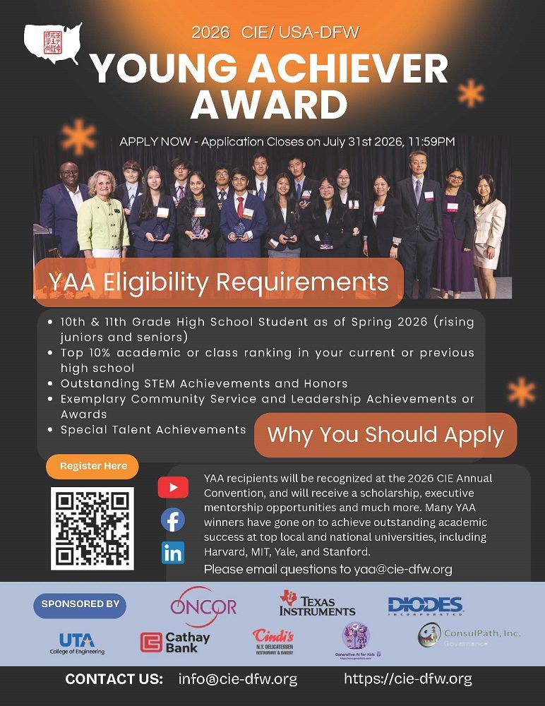 The Young Achiever Award (YAA) is one of the flagship programs of CIE/USA-DFW. The YAA is designed to encourage and recognize the younger generations of CIE members to achieve high academic performance, develop leadership skills, develop a strong interest in science and engineering, and excel in extracurricular and community volunteer activities. These well-rounded skills will enable them to become strong leaders in this very competitive global marketplace and achieve the greatest possible impact in our community.