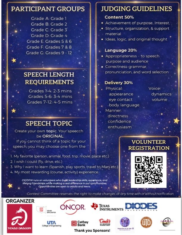 The goal of the contest is to stimulate young students’ interests and boost their confidence and competence in public speaking by providing an opportunity for them to enhance their speech skills. This event has served the DFW community for over 10 years, and each year it attracts over 100 students from 1st to 12th grades for the contest and hundreds of participants including parents, educators, and volunteers involving this event.