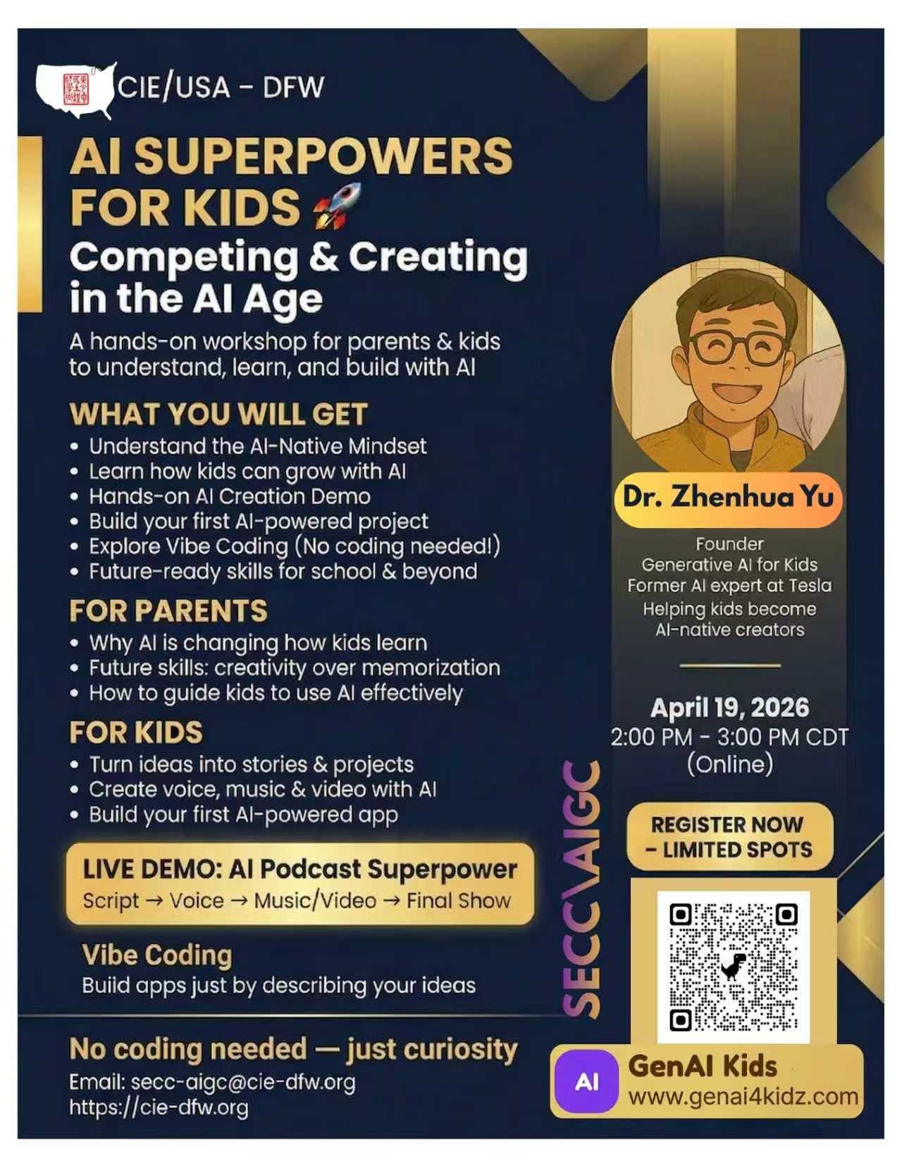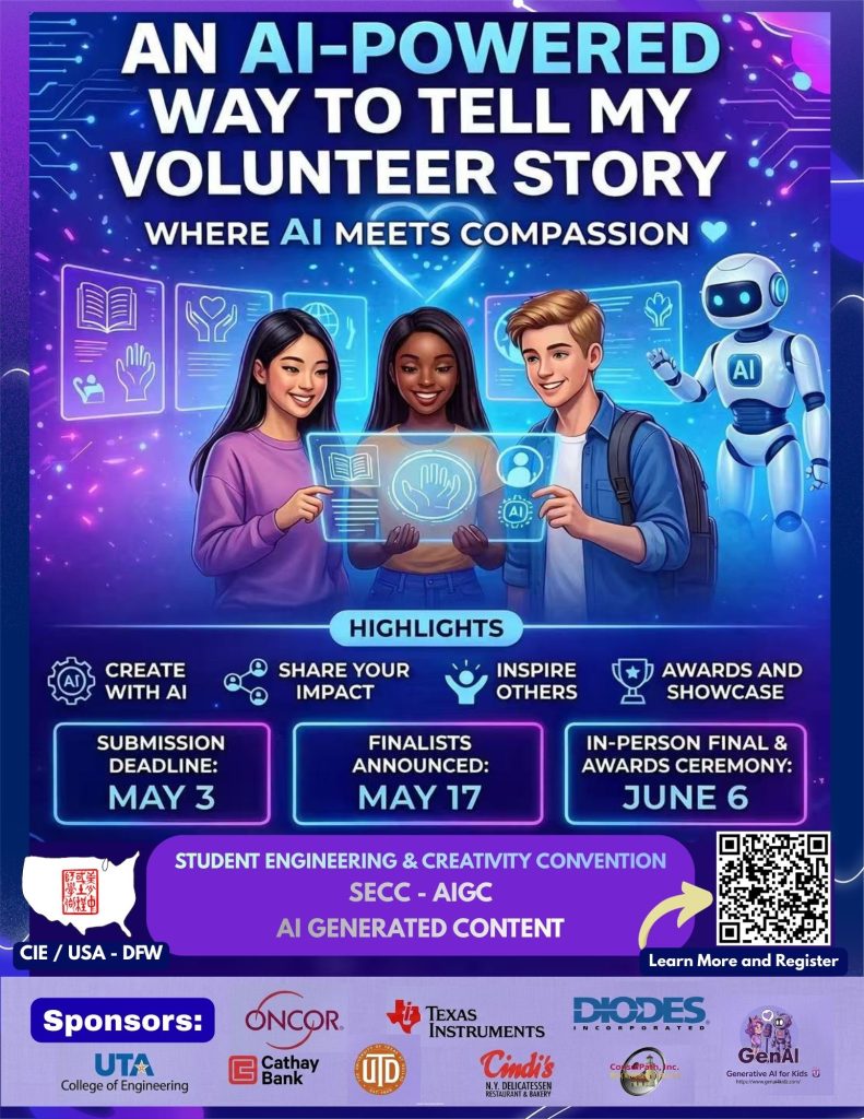 The AI Generated Content (AIGC) program is a new initiative of CIE/USA-DFW. The 2026 AIGC Creative Challenge invites students to create an AI-assisted creative project inspired by a real volunteer experience, highlighting personal reflection, creativity, and community impact. By combining creativity, technology, and service, participants will gain inspiration and technical knowledge through online workshops and showcase their work at the final competition.