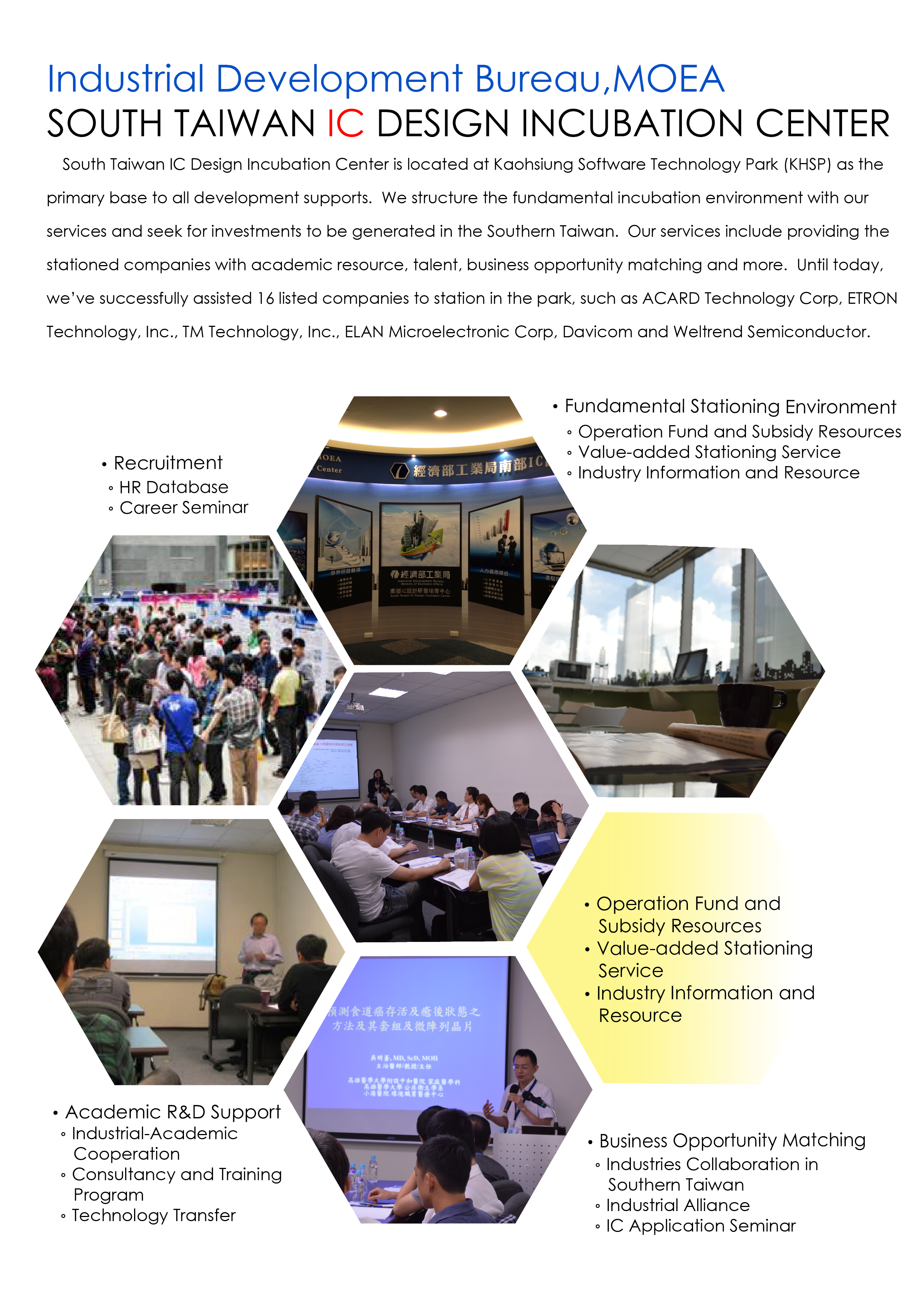 Our ultimate goal is to support the growth and development of the stationed companies in the Southern Taiwan. Besides the fundamental business set-up environment, we integrate the local talent, academic and enterprise alliance resources to provide the stationed companies for the services of industrial-academic cooperation and business opportunity matching. In addition, we also provide the supports and assistances for the stationed companies to apply for the subsidies and fund resources from government, venture capitalist and angel investors.